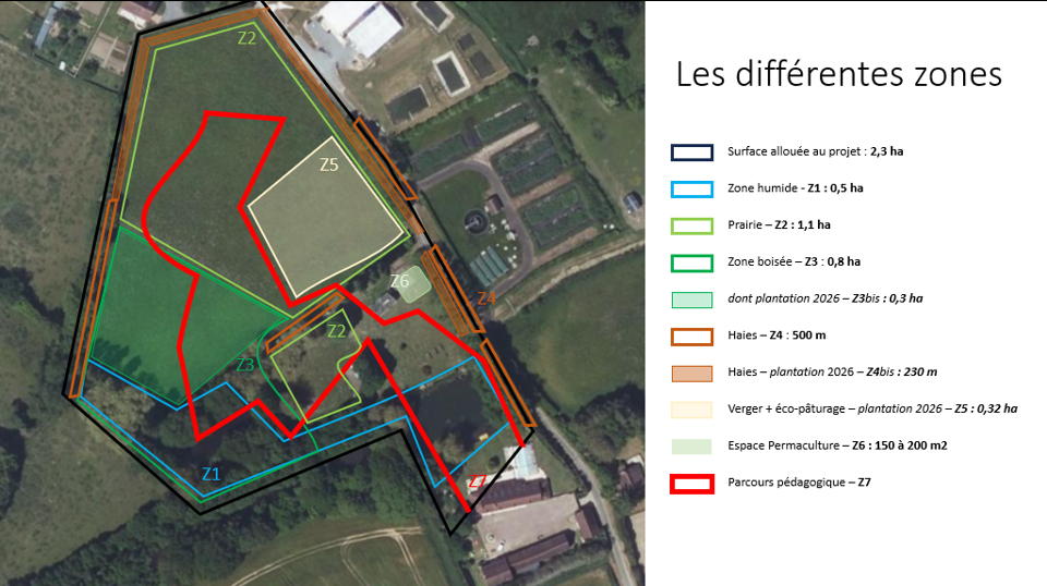 Définition des zones conditionnant les différents habitats (zone humide, zone boisée, prairies et haies) - cf. schéma ci-contre.